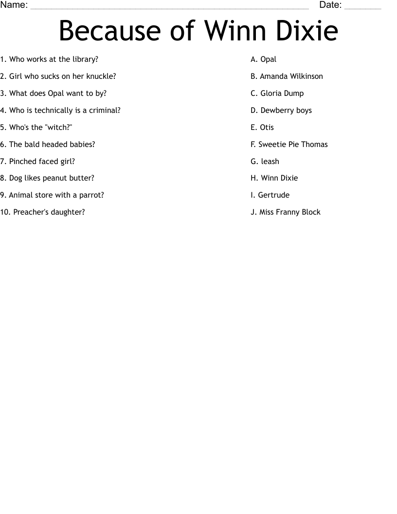 Reading Comprehension Quiz Because Of Winn Dixie Ch 5 8 My Worksheet Maker Create Your Own Worksheets
