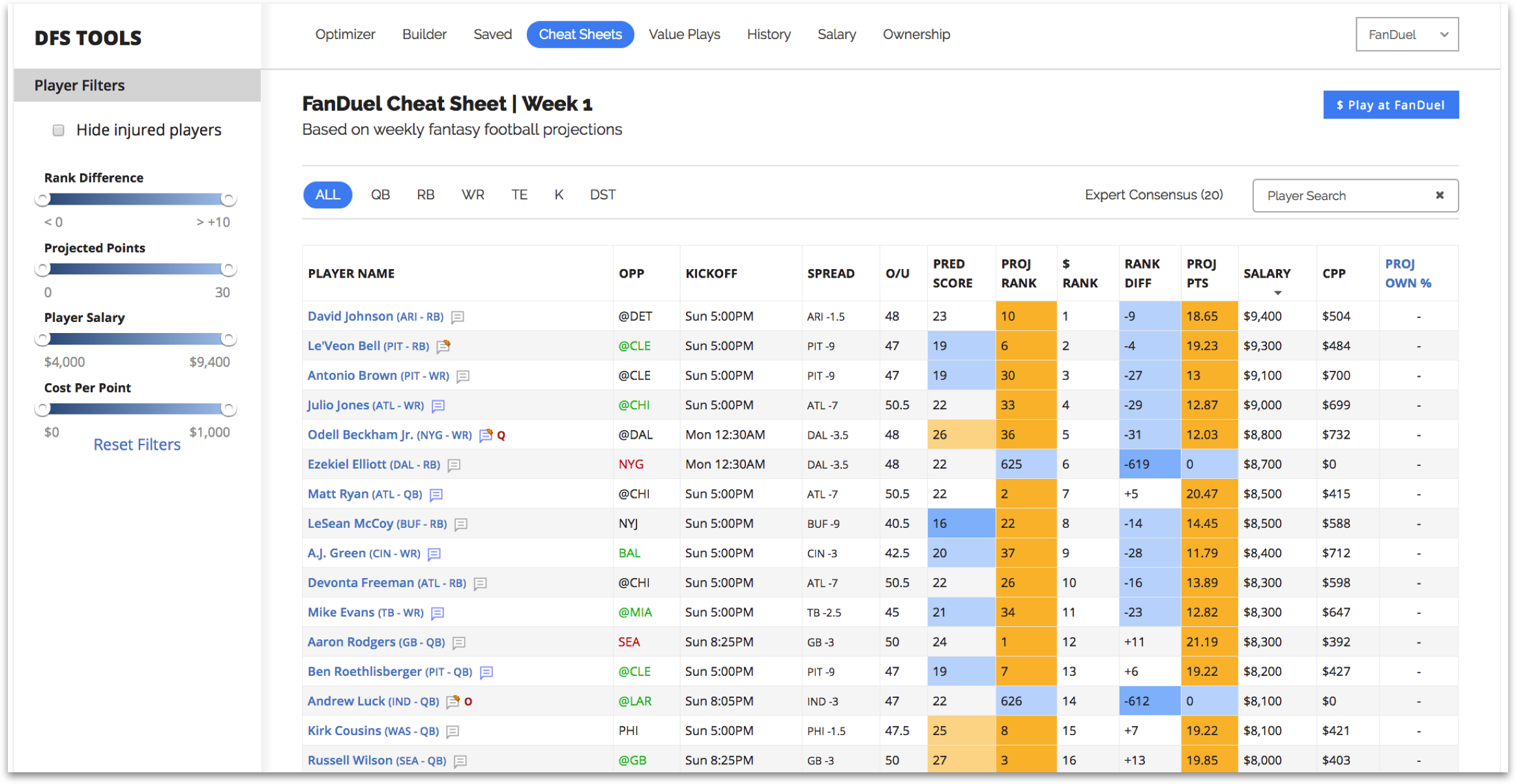 Daily Fantasy Football Cheat Sheet Daily Fantasy DFS FantasyPros