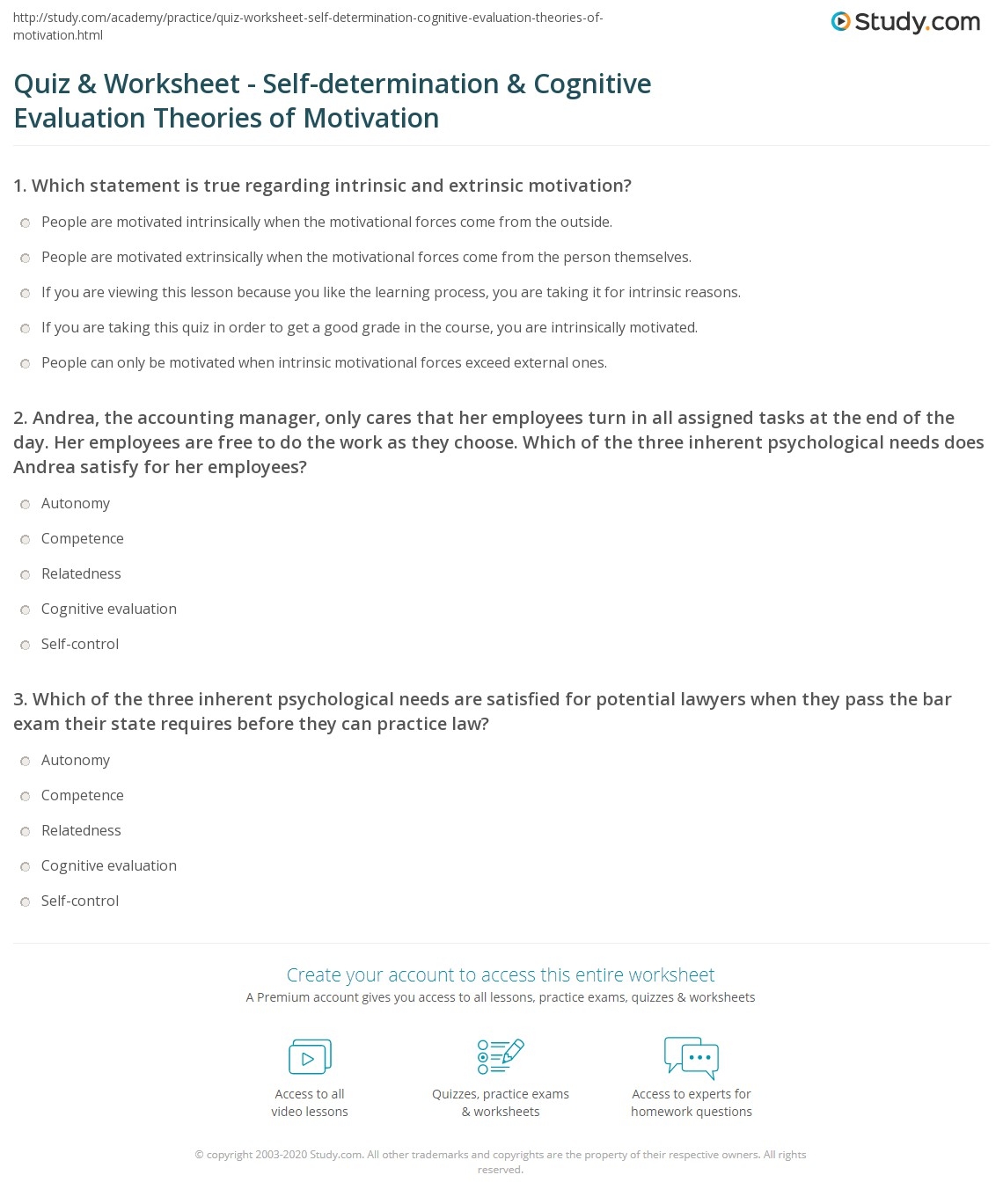 Quiz Worksheet Self determination Cognitive Evaluation Theories Of Motivation Study