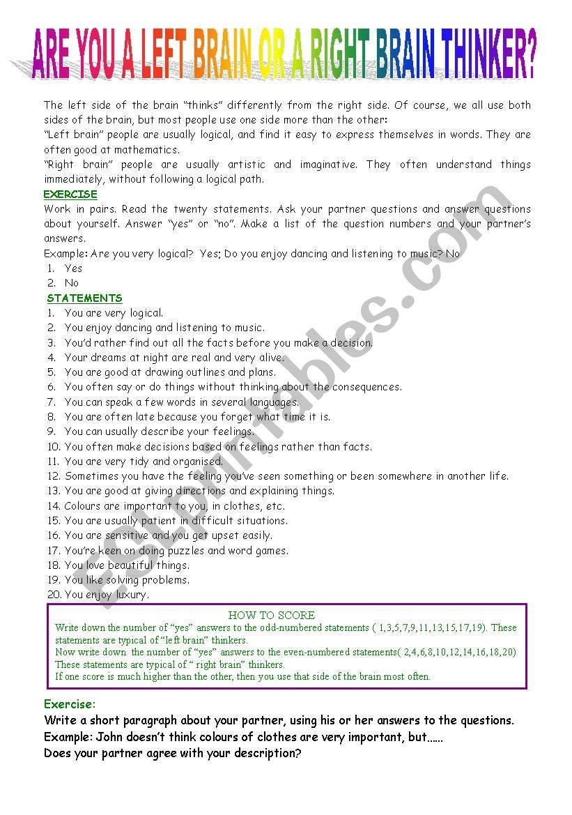 Left Or Right Brain Quiz Printable