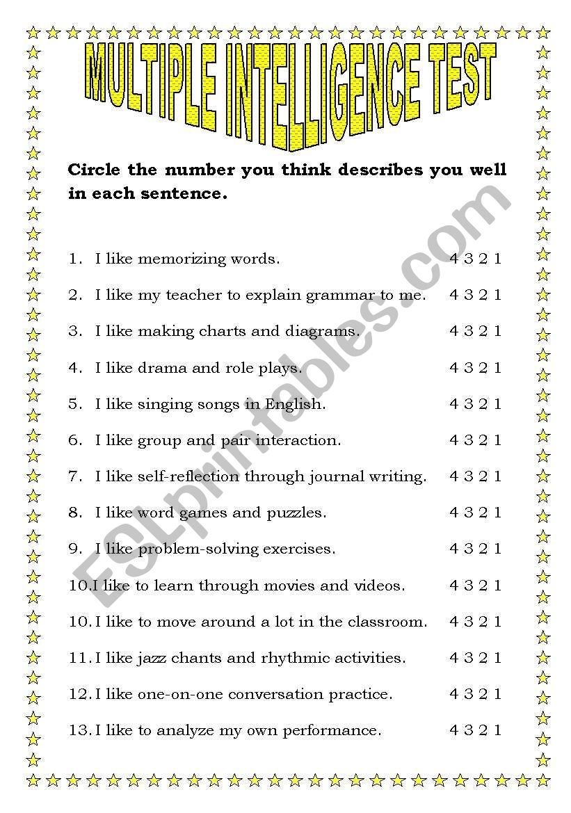 MULTIPLE INTELLIGENCE TEST WITH KEYS ESL Worksheet By Chatina25