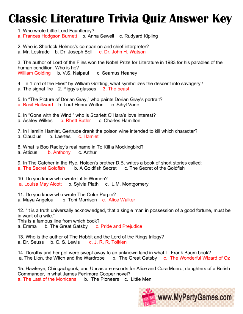 Free Printable Classic Literature Trivia Quiz With Answer Key
