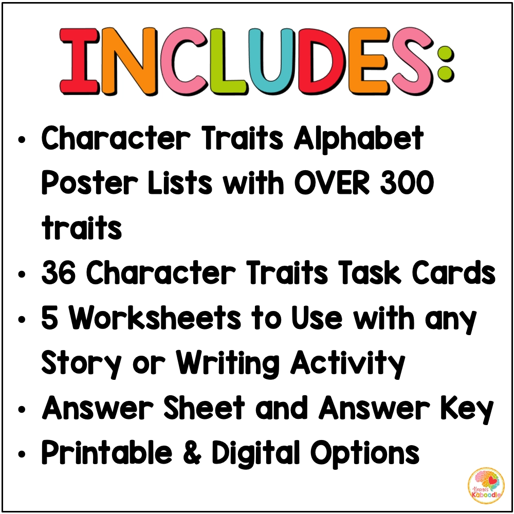 Character Traits Activities Word Lists Task Cards And Worksheets