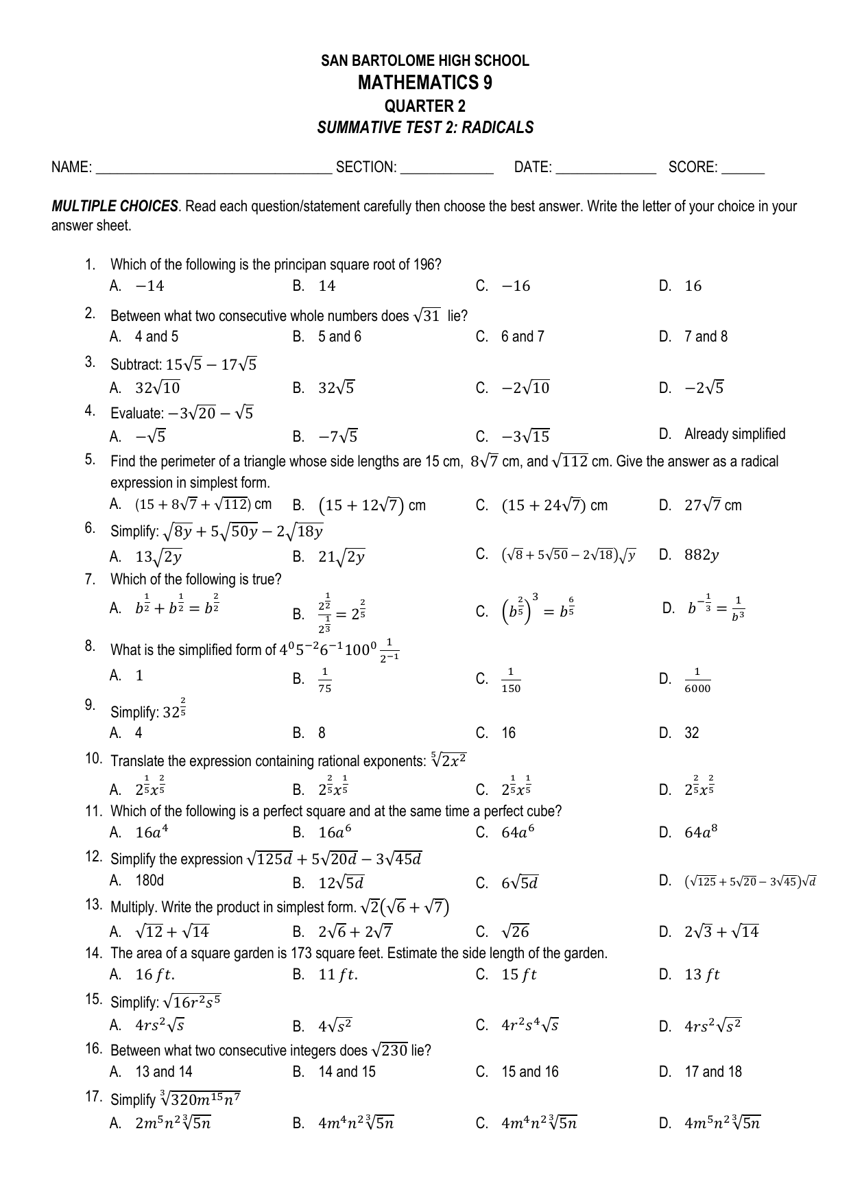 Whether you’re a student studying for a math test or just someone looking to brush up on your algebra skills, a printable quiz for simplest radical form can be a great tool. It’s a convenient way to test your knowledge and track your progress.