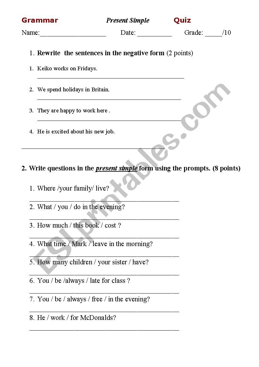 Questions In Simple Present Quiz Printable