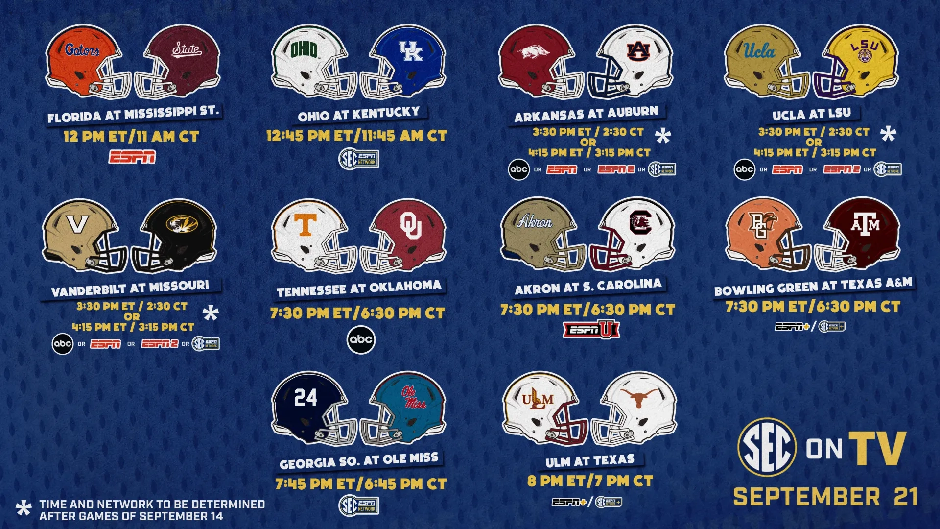 SEC Football TV Schedule For Games Of September 14 And 21 Southeastern Conference